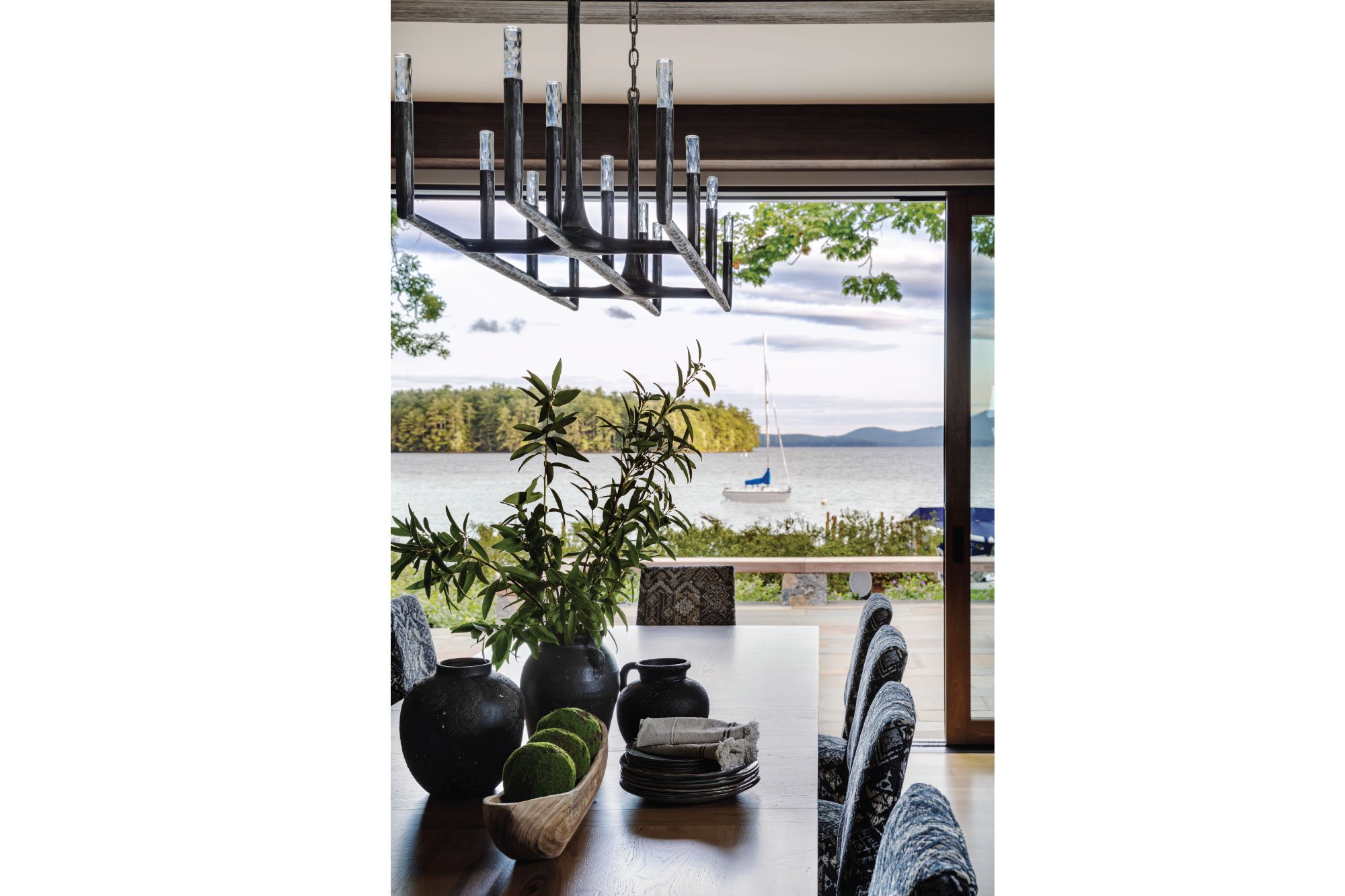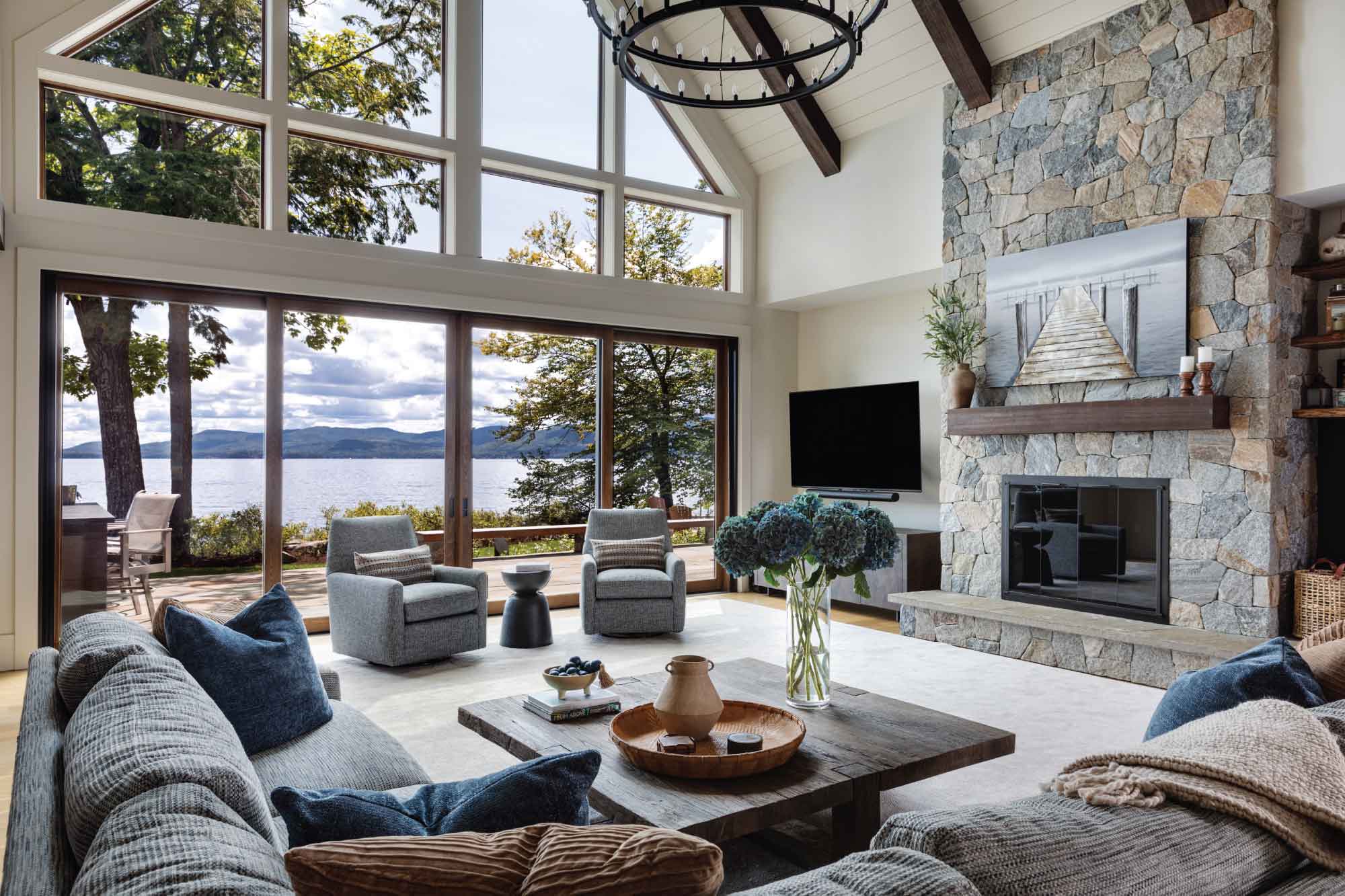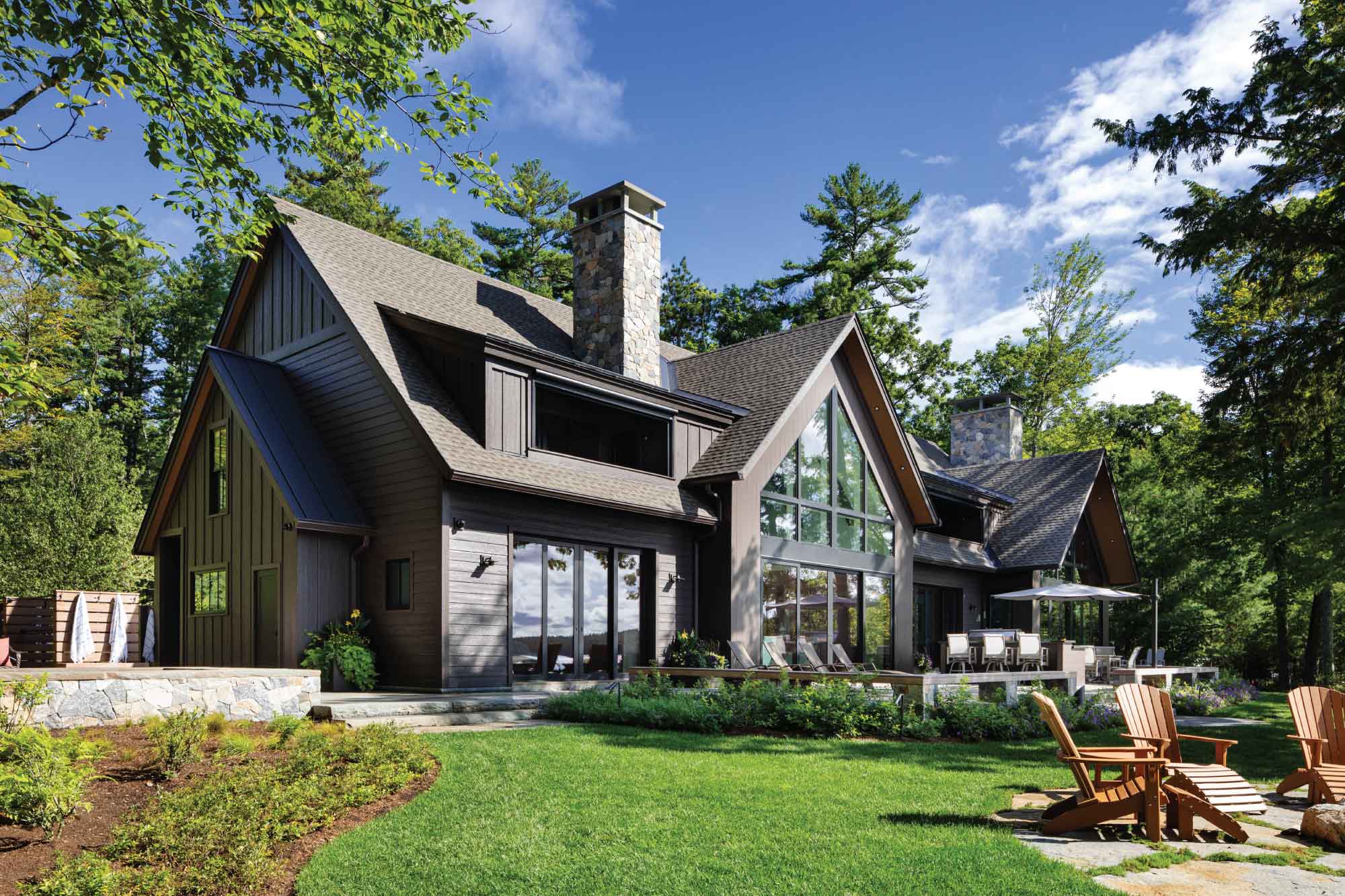 Nestled along the serene shores of Lake Winnipesaukee, this extraordinary 11,000-square-foot family home is designed to accommodate over 20 family members during the warm Lakes Region months. With unparalleled views of the Broads, the residence captures the essence of lakeside living, offering a haven of luxury and comfort. Surrounded by lush greenery, the client sought seamless integration with the landscape, leading to the exterior featuring a dark cladding that harmonizes with the surroundings and expansive openings that mirror the natural beauty of the area.