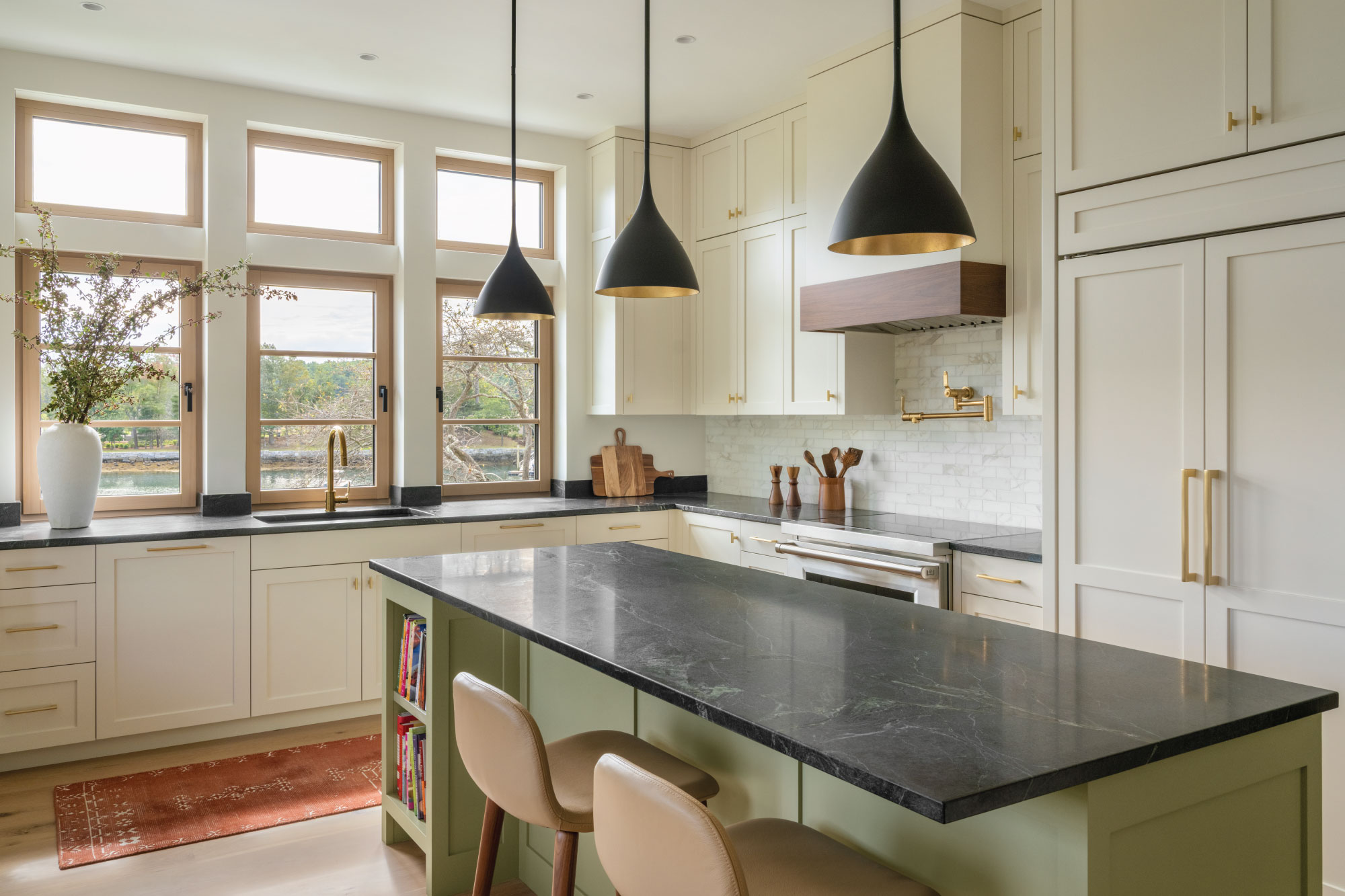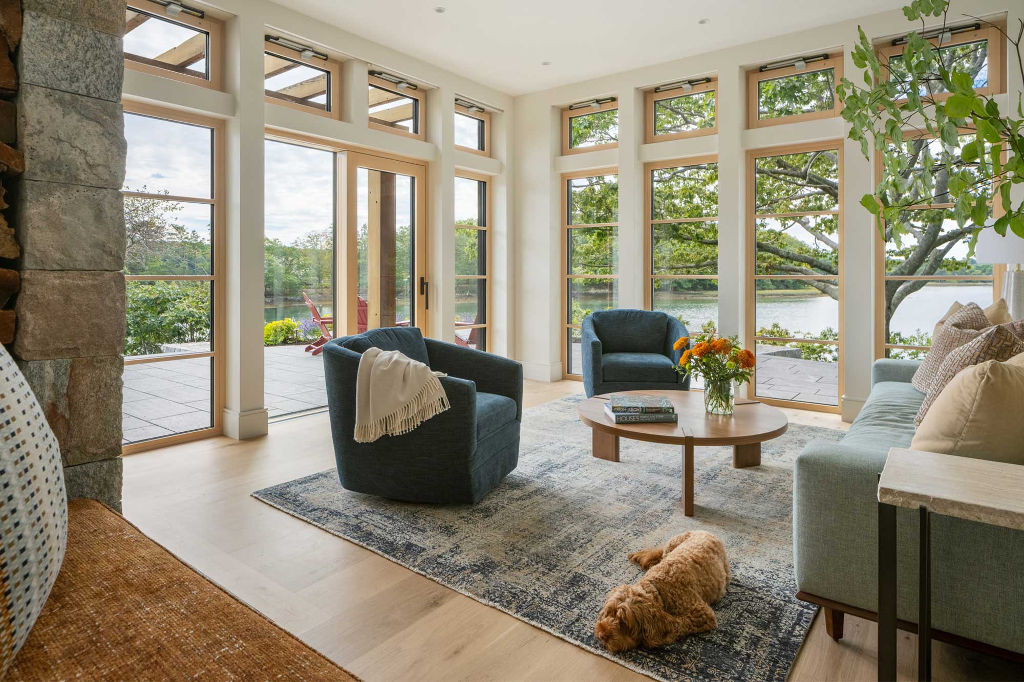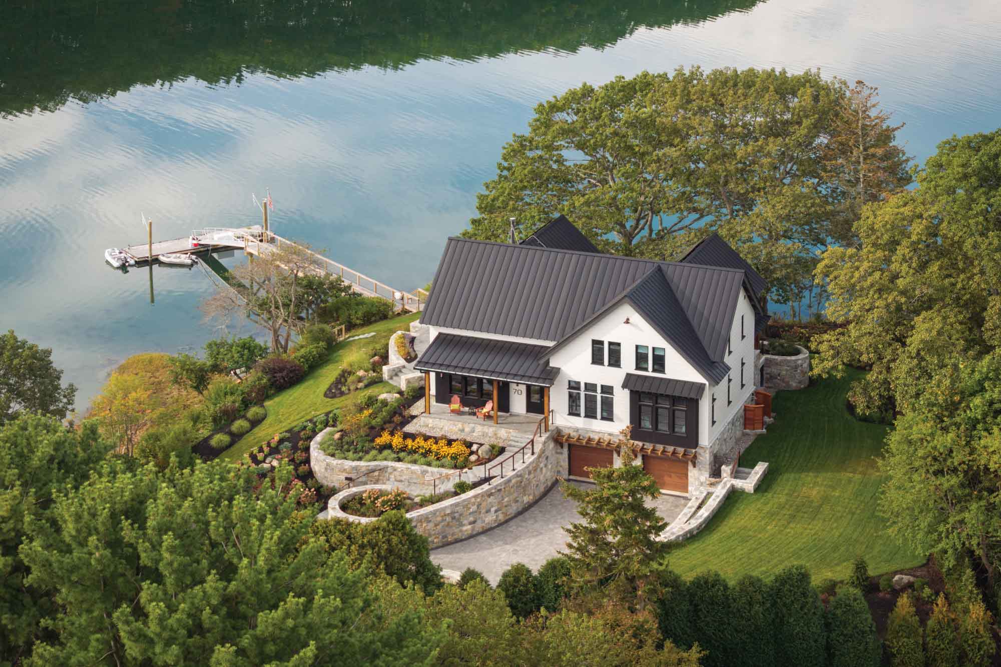 The home is sited to maximize passive solar gain and minimize energy use. Large south-facing windows capture views of the ocean and let in the sun's rays in the winter, while smaller north-facing windows reduce heat loss in the winter. An efficient layout minimizes the exterior envelope and reduces energy usage. With its double stud exterior wall assembly, this home is expertly insulated to retain warmth during the winter and coolness during the summer.
