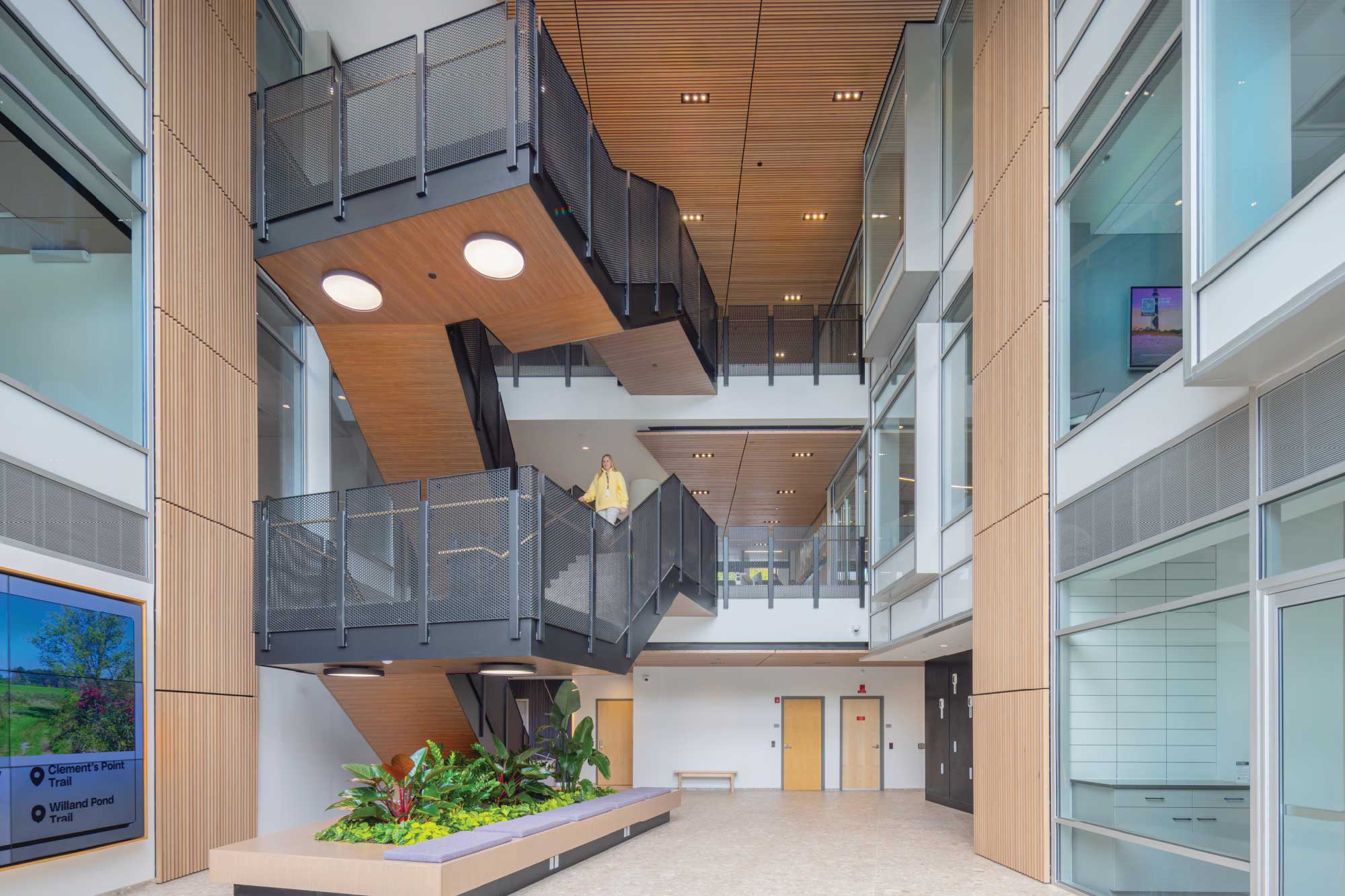 After conducting in-depth programming and collaborative envisioning sessions with each department, several key design influences came to the forefront: a strong emphasis on incorporating natural light, prioritizing employee well-being, optimizing a hybrid work model, and fostering collaboration and creativity. Maugel DeStefano's interiors team approached the design with a biophilic mindset, exploring the connection between humans and nature, and selected natural materials that harmonized with the landscape, creating an organic, modern aesthetic.
