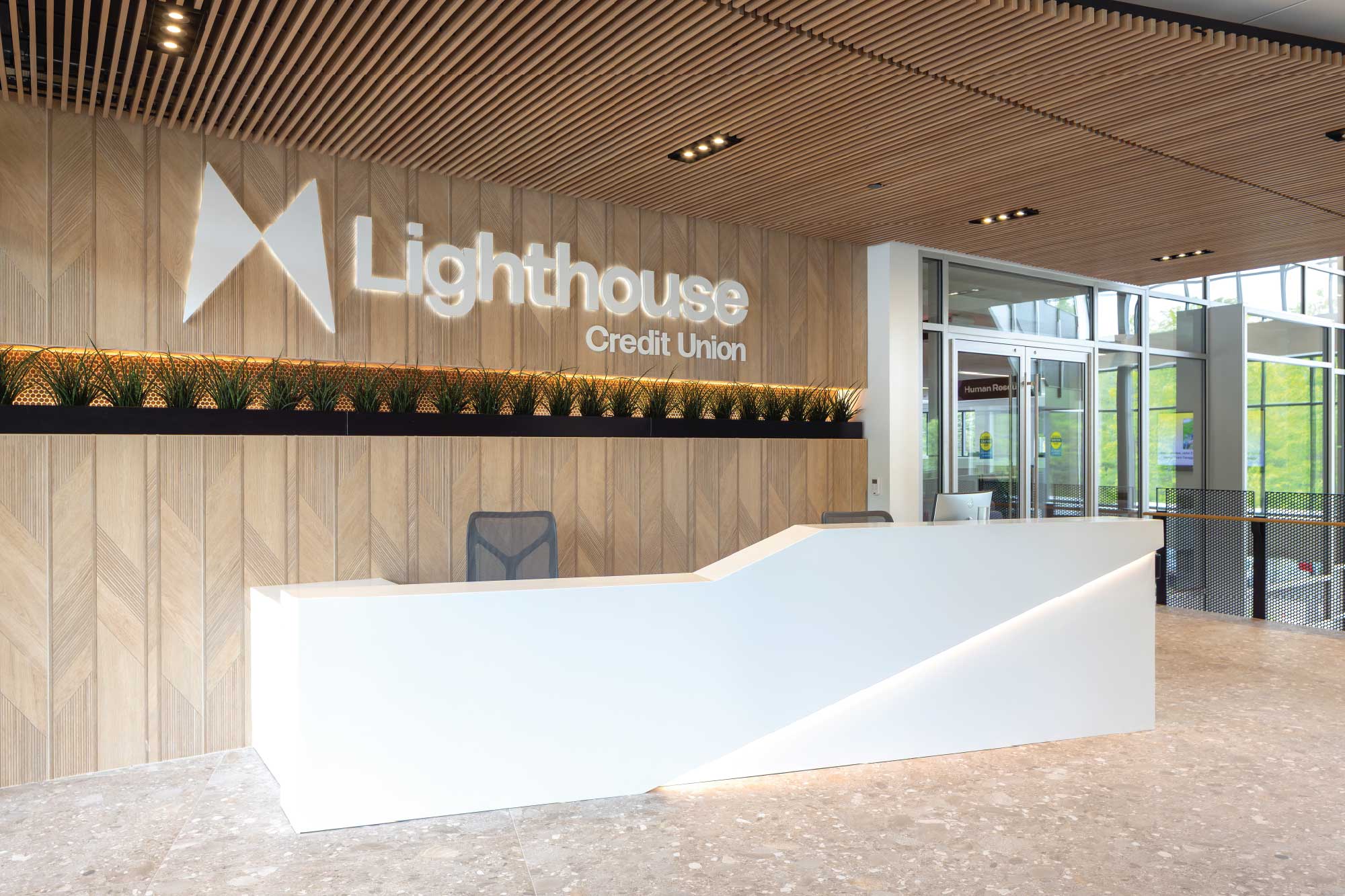 Maugel DeStefano's interiors team designed the 100,000 SF interior transformation of Lighthouse Credit Union's new headquarters located in Dover, NH. In July of 2022, Maugel DeStefano partnered with Lighthouse Credit Union (formerly Northeast Credit Union) to provide guidance during the site selection process. After careful consideration, the credit union chose the building at 100 Education Way. The exterior of the building went through a complete transformation by PROCON, the Architect of Record and design-builder, who incorporated new facade materials.