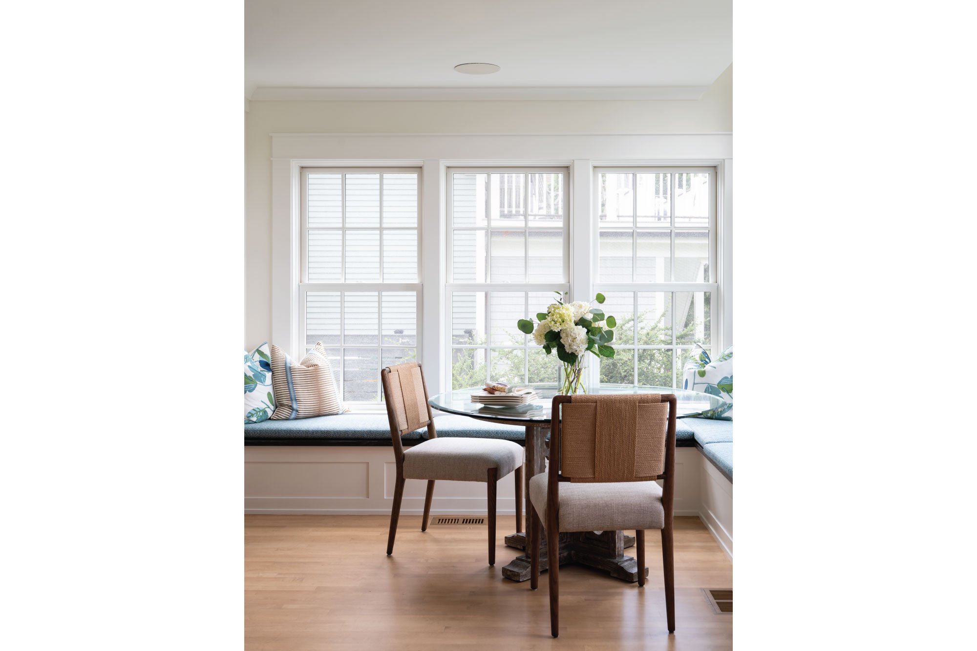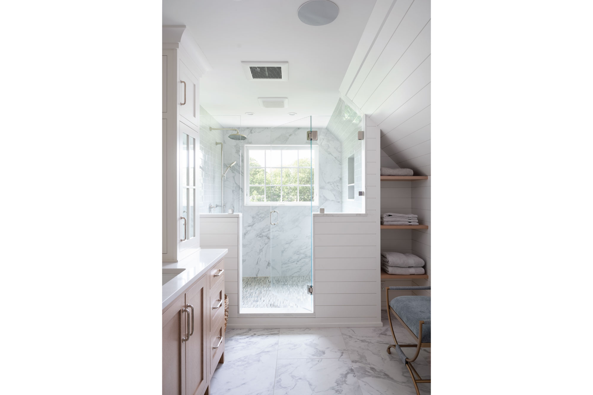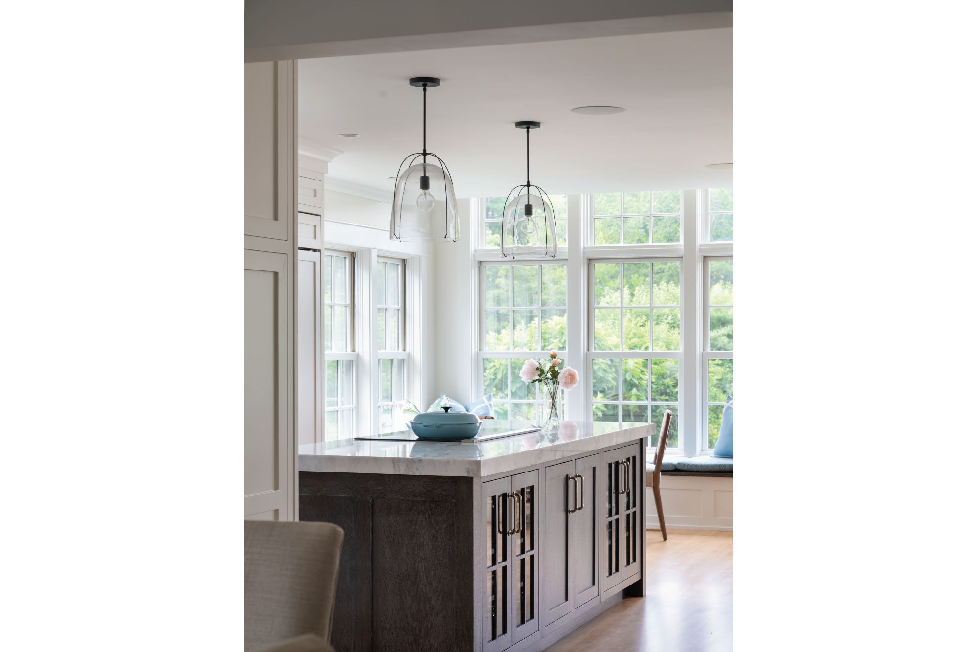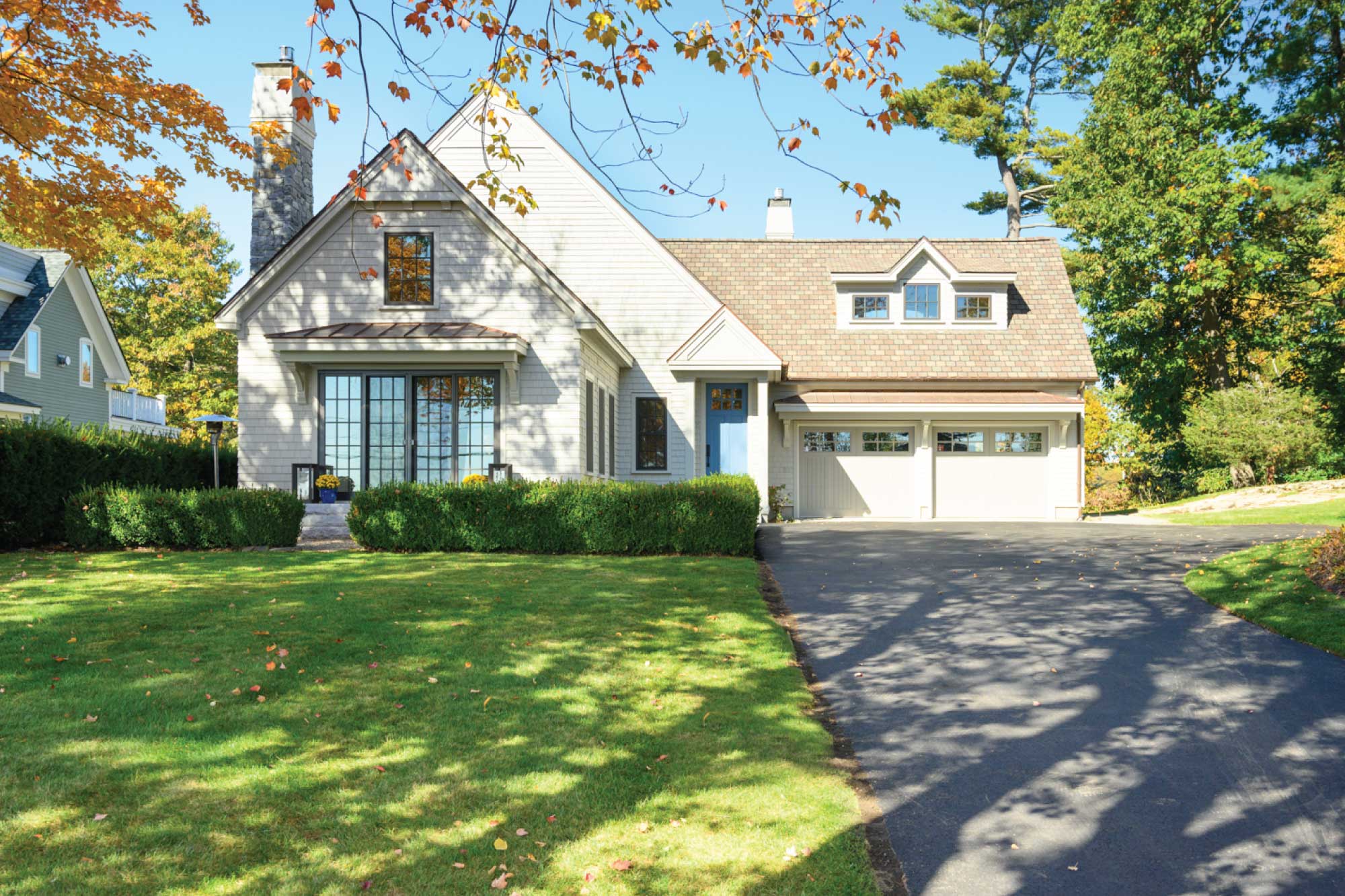 Reclad in cedar shingles and detailed with gables, bracketed awnings, a petite portico, and fieldstone-clad chimneys, the home’s exterior was transformed with timeless character. Inside, a reconfigured plan allows the kitchen, anchored by a central island, to flow into a bright family room and breakfast nook. The living room now opens onto a new patio, while the expanded primary suite features a larger bath and cleverly integrated storage. Together, these updates create a light-filled retreat firmly rooted in its coastal context.