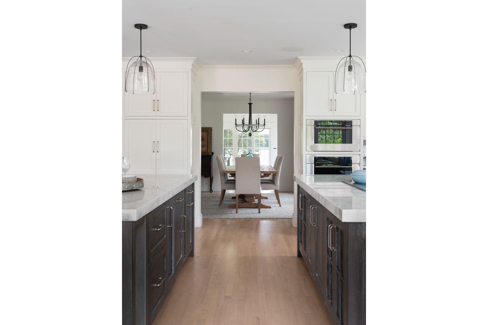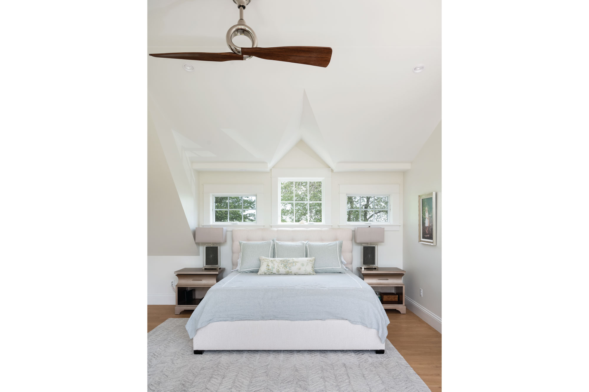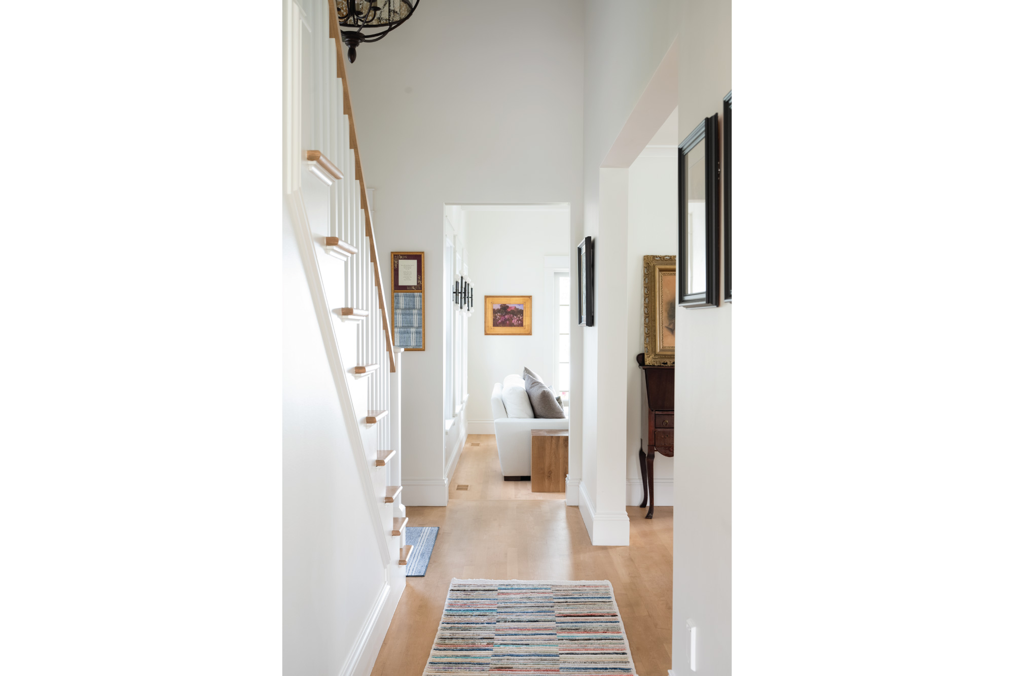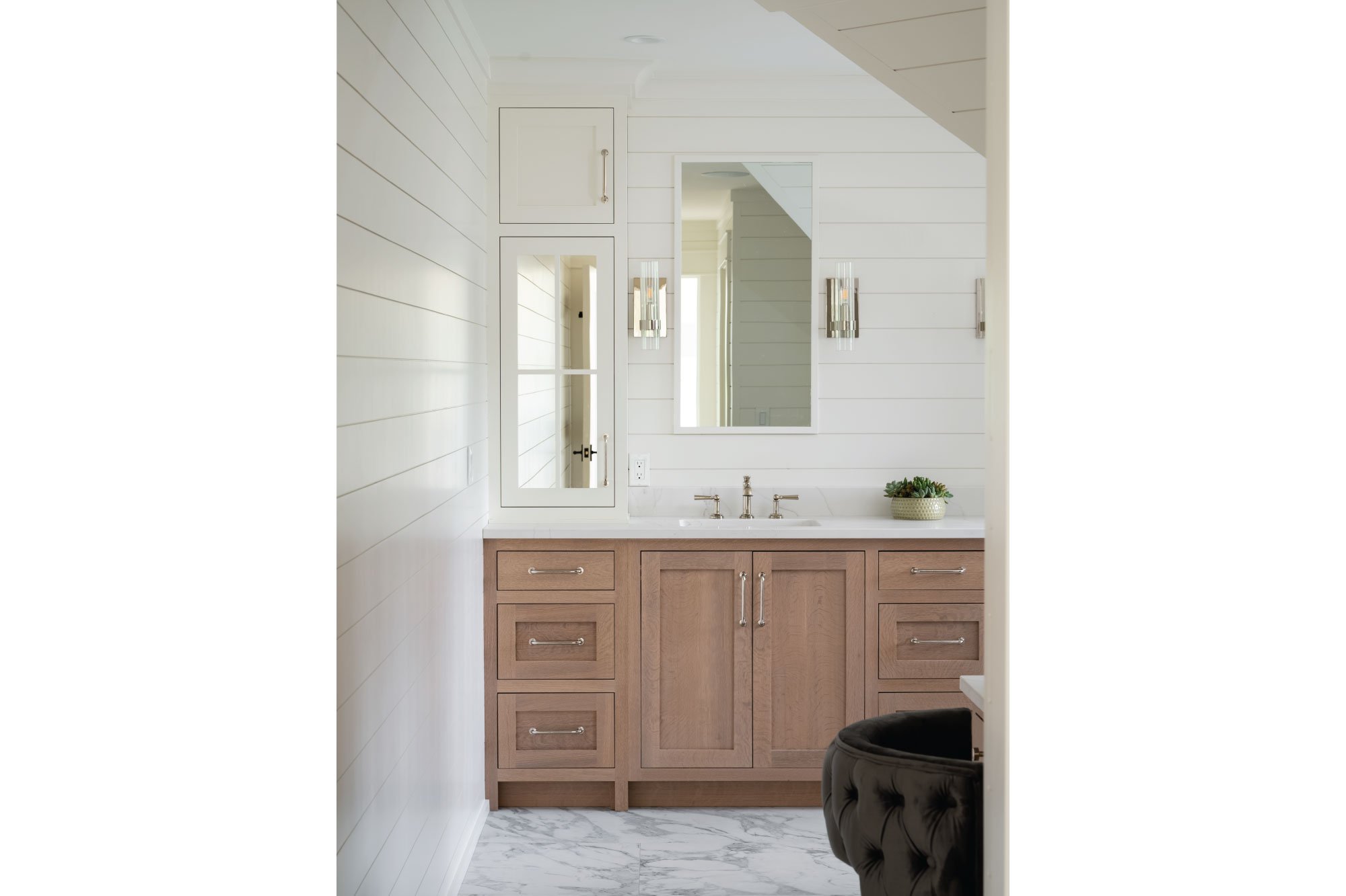 Reclad in cedar shingles and detailed with gables, bracketed awnings, a petite portico, and fieldstone-clad chimneys, the home’s exterior was transformed with timeless character. Inside, a reconfigured plan allows the kitchen, anchored by a central island, to flow into a bright family room and breakfast nook. The living room now opens onto a new patio, while the expanded primary suite features a larger bath and cleverly integrated storage. Together, these updates create a light-filled retreat firmly rooted in its coastal context.