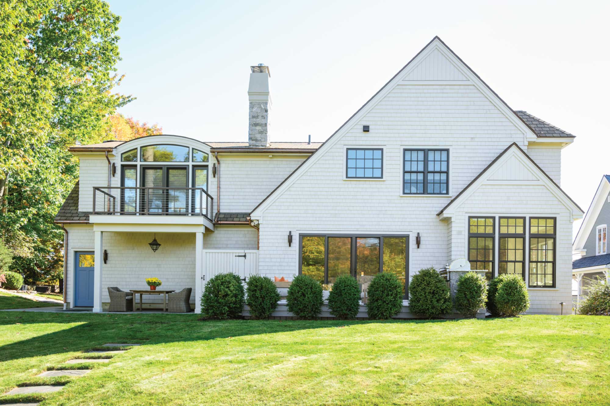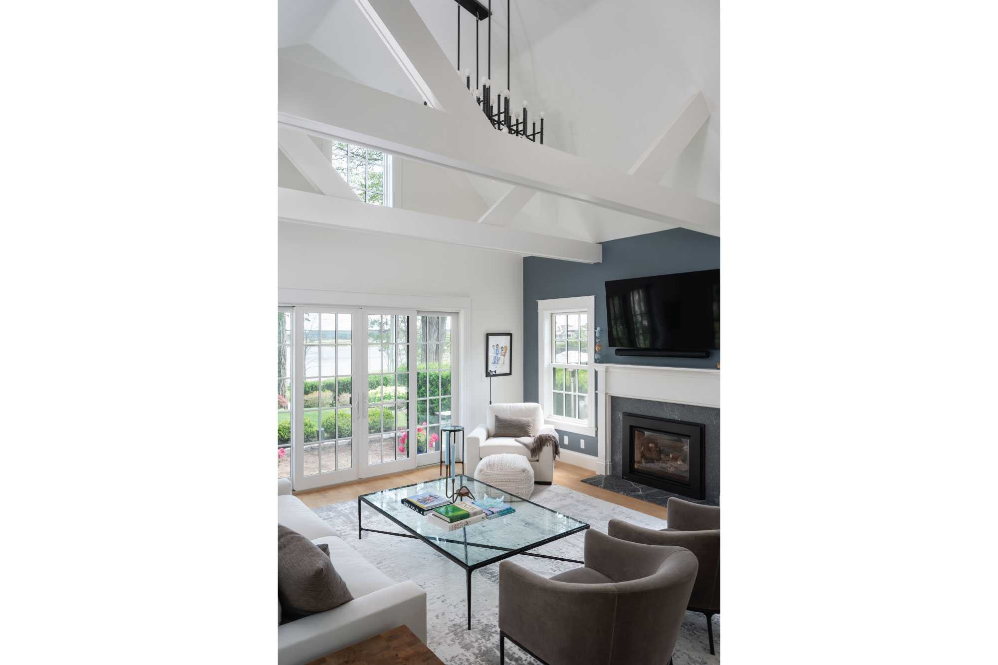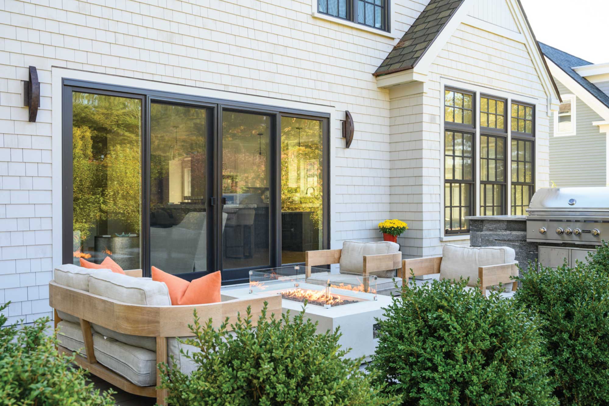 The owners of this three-bedroom home envisioned it as their forever house and sought updates that would modernize it without compromising its character. Working within the existing footprint, the team refreshed the exterior and brought in more natural light. Drawing inspiration from neighboring homes, the Seacoast setting, and sweeping river views, the design emphasizes indoor-outdoor connection with new windows, bifold doors, and a deck off the kitchen. Outdoor amenities—including a firepit, patios, and an outdoor kitchen—further extend living space.