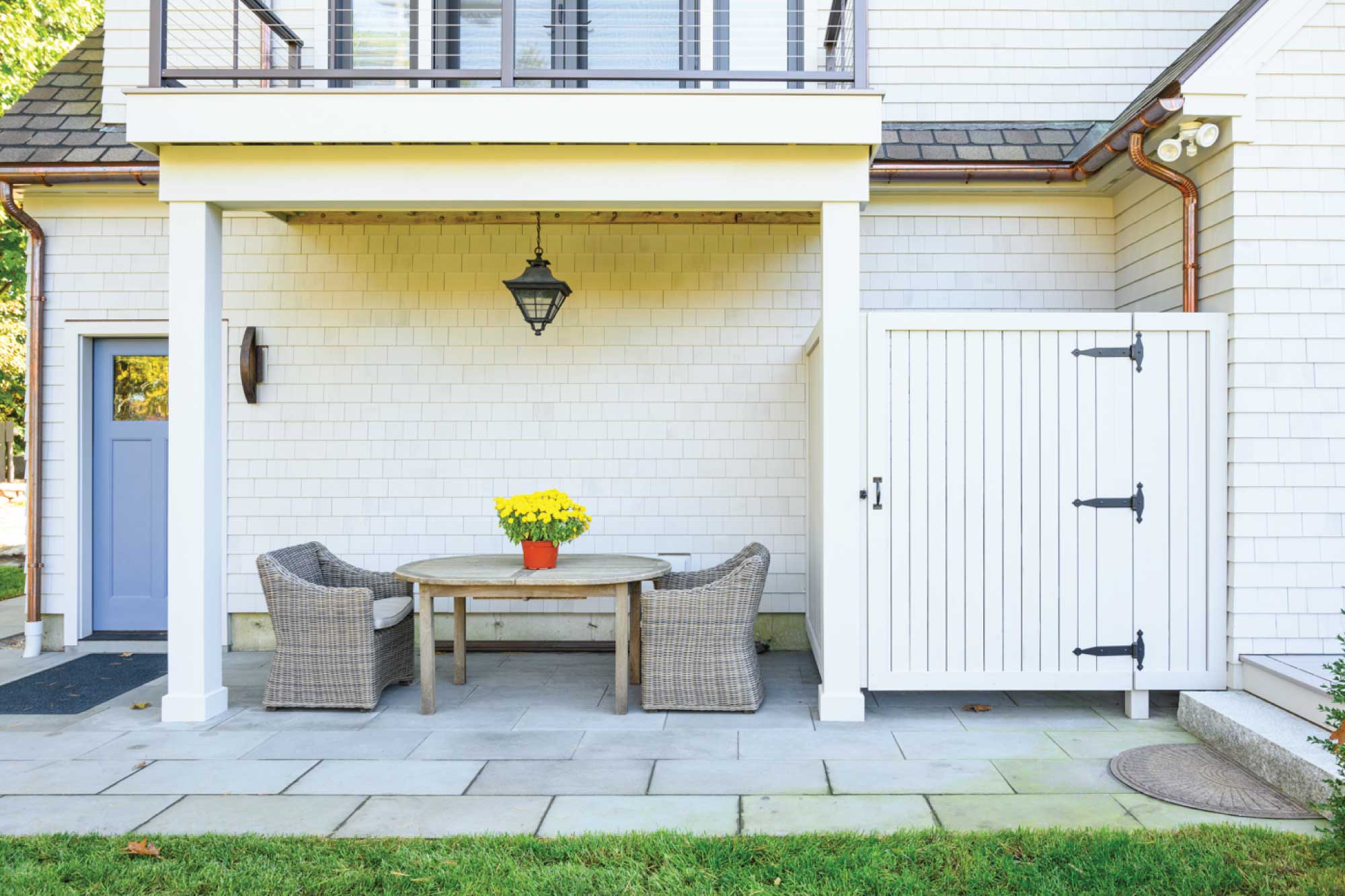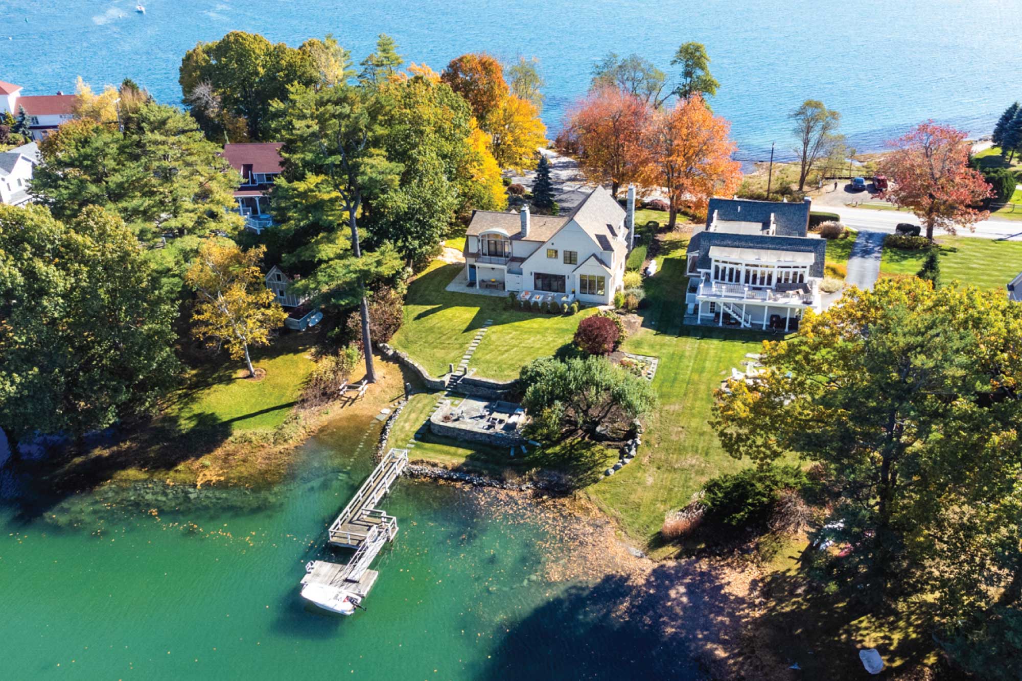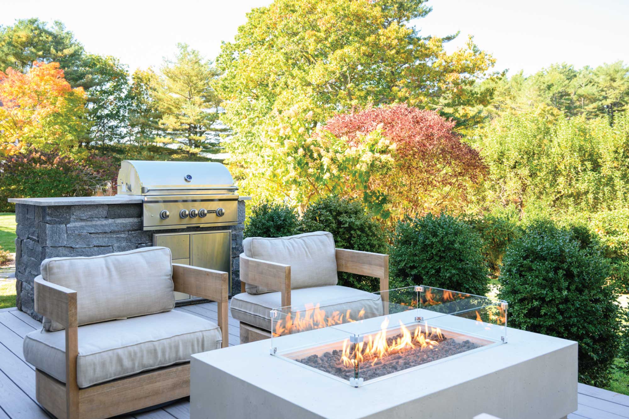 The owners of this three-bedroom home envisioned it as their forever house and sought updates that would modernize it without compromising its character. Working within the existing footprint, the team refreshed the exterior and brought in more natural light. Drawing inspiration from neighboring homes, the Seacoast setting, and sweeping river views, the design emphasizes indoor-outdoor connection with new windows, bifold doors, and a deck off the kitchen. Outdoor amenities—including a firepit, patios, and an outdoor kitchen—further extend living space.